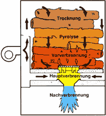 Die Trocknung der Restfeuchte im Holz, Vergasung (Pyrolyse) und Vorverbrennung der Leicht brennbaren Bestandteile findet wie üblich im Füllschacht statt. Dabei Liegt der Brennstoff auf einem Wirbelkammerbrenner. In der Mitte des Bodens befindet sich eine Turboscheibe. Die Verbrennungsgase strömen nach unten durch die Lamellen der Scheibe, wobei es aufgrund der Verwirbelung mit Sekundäluft zur Hauptverbrennung kommt. Bei Temperaturen bis 1100 °C verbrennen nun auch die schwerzündenden Bestandteile. Die nach unten austretende Flamme der Nachverbrennung mit starker Blaufäbung ähnelt einer Gasflamme.